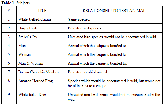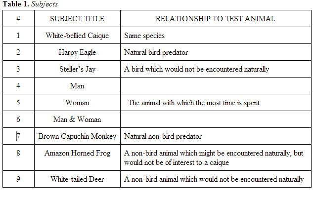 has some relationship to the test animal, a white-bellied caique (see Table 1. Subjects). There were three bird subjects, three human subjects, and three