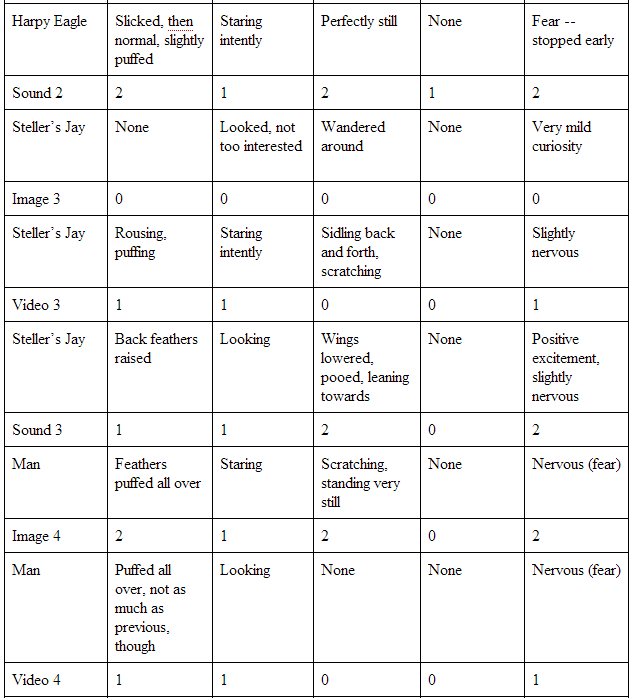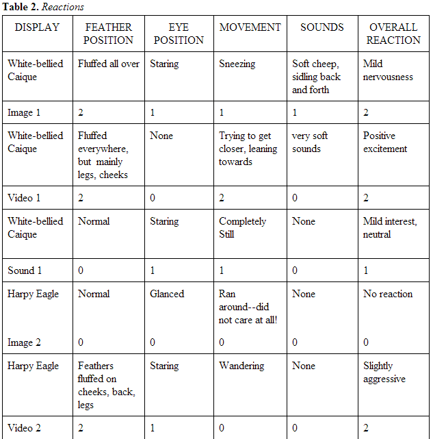 my observations (see Table 2. Reactions). I used nine “subjects” -- animals displayed -- in the displays: a white-bellied caique, a harpy eagle, a steller’s