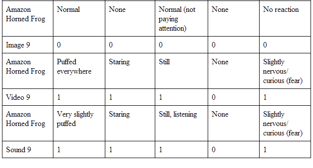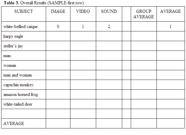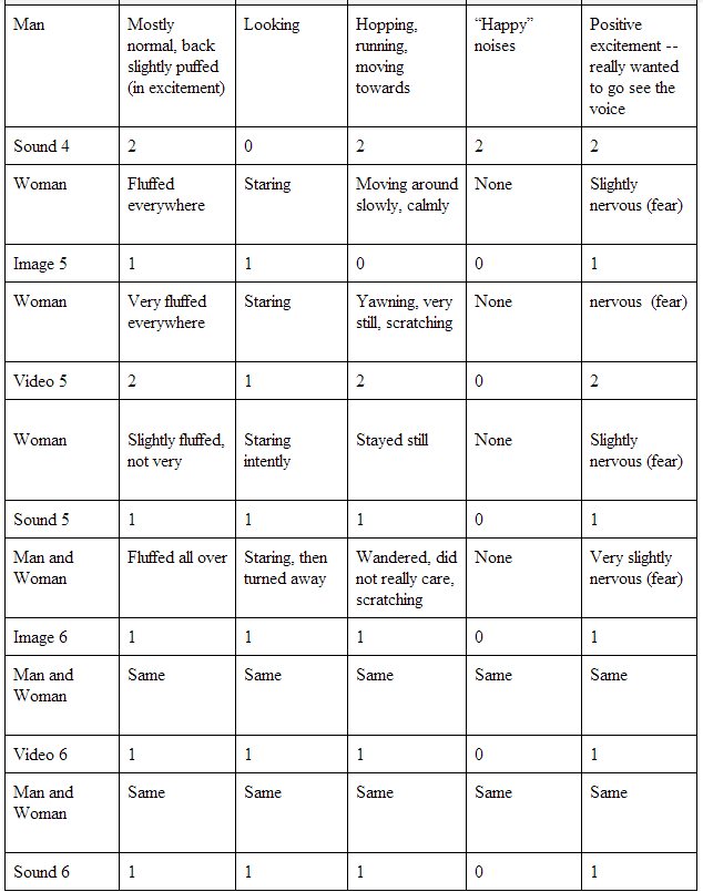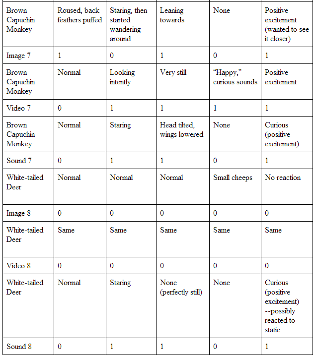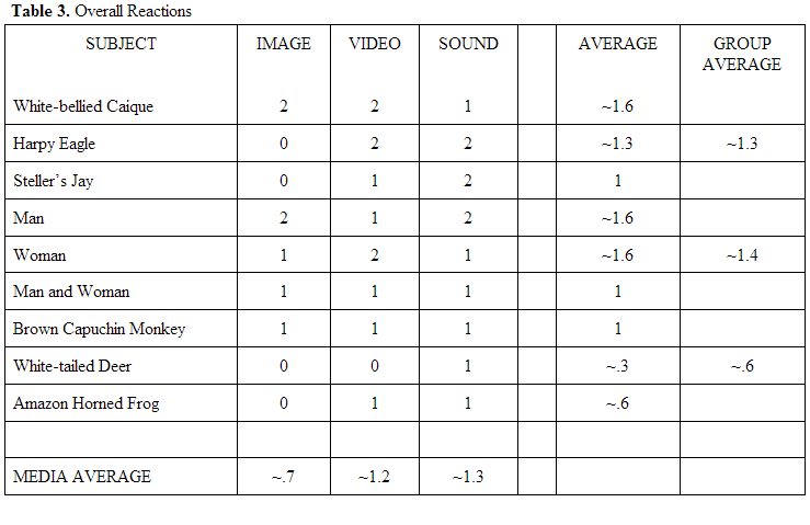 Table 3 shows all my final results. The form of media which elicited the strongest reaction from my caique was the sounds, with an average reaction of ~1.3.