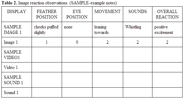 my caique nine still images, nine videos, and nine audio clips for one minute each, and I observed and evaluated my caique’s responses to each, recording