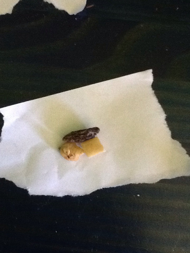 1. Cut a rectangle of paper about 2" wide x 4" long. Place a few small treats in the center of the paper.